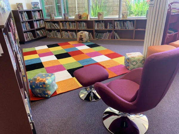 In May 2021, we completed another library refurbishment, this time at Edenvale Elementary in South San Jose, a school whose student population is 82% socioeconomically disadvantaged, and 62% English Language learners. As with all of our projects, the books we selected for the library represented the diversity of the school, both linguistically and culturally, allowing students to see themselves and their families in the new books in their library. The books were processed off site once again, this time with twenty volunteers at outdoor picnic tables on a balmy day in May. Our project brought 985 brand-new high interest books into the library, as well as a new colorful rug and teacher chair for story time in the library.